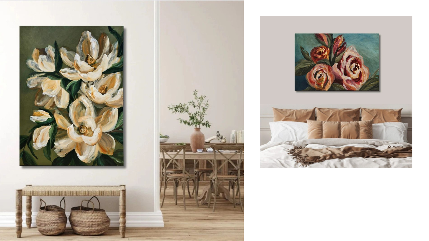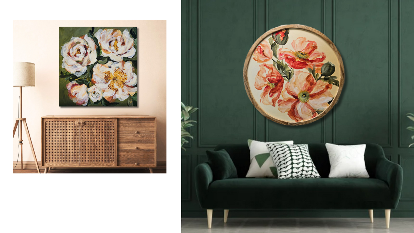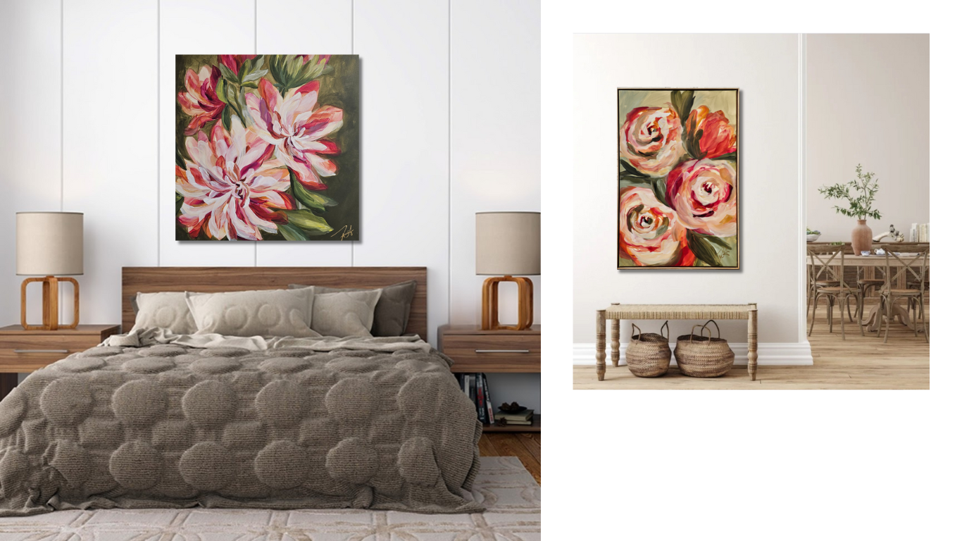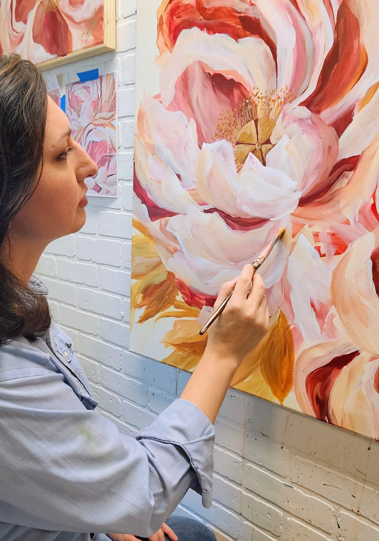With my technique of painting, I use acrylic paint as my preferred medium. I apply multiple layers of colors to create the depth of the flower and spontaneous brushstrokes to capture the essence of these beautiful moments.