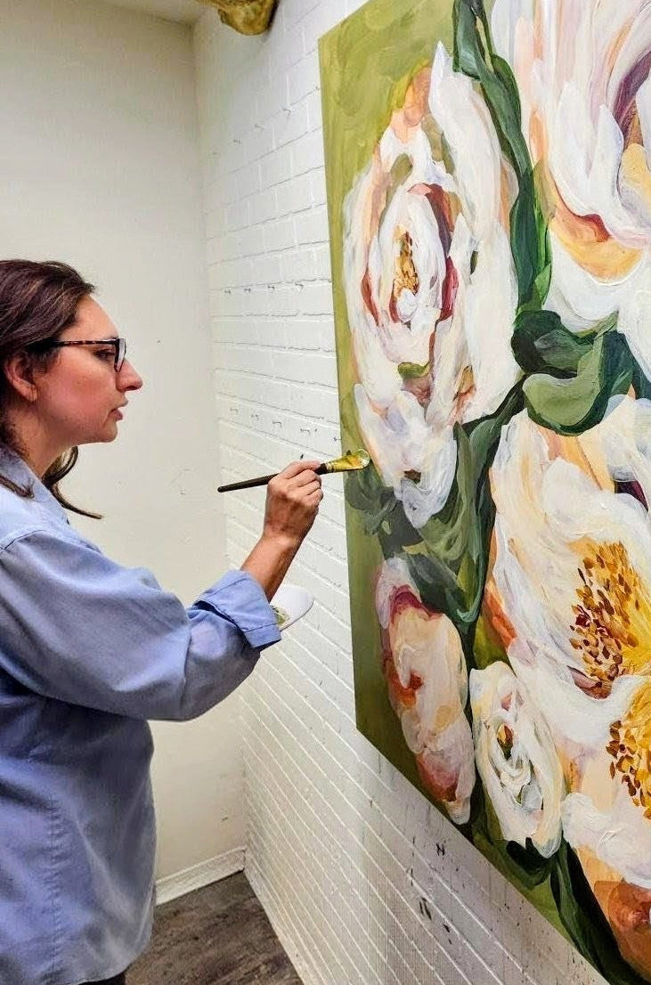 Zoe White is a self-taught artist celebrated for her expressive floral paintings. A proud Texan raised in The Woodlands area, she finds great joy in capturing the beauty of flowers through vibrant layers of translucent acrylic glazing, woven together with her signature expressive brushstrokes. Her hope is that each painting brings life, color, and a sense of flourishing to every space it touches.