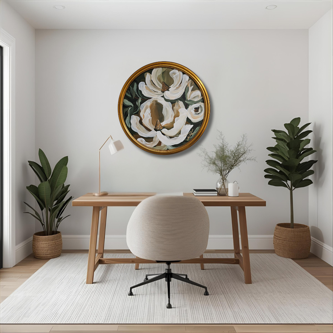 - This gorgeous magnolia flower painting features a perfect creamy whites blends with lush foliage and mossy green background. It is an original hand-painted acrylic masterpiece on a 20in round canvas, complete with a gold round frame and pre-installed hardware for easy wall mounting.