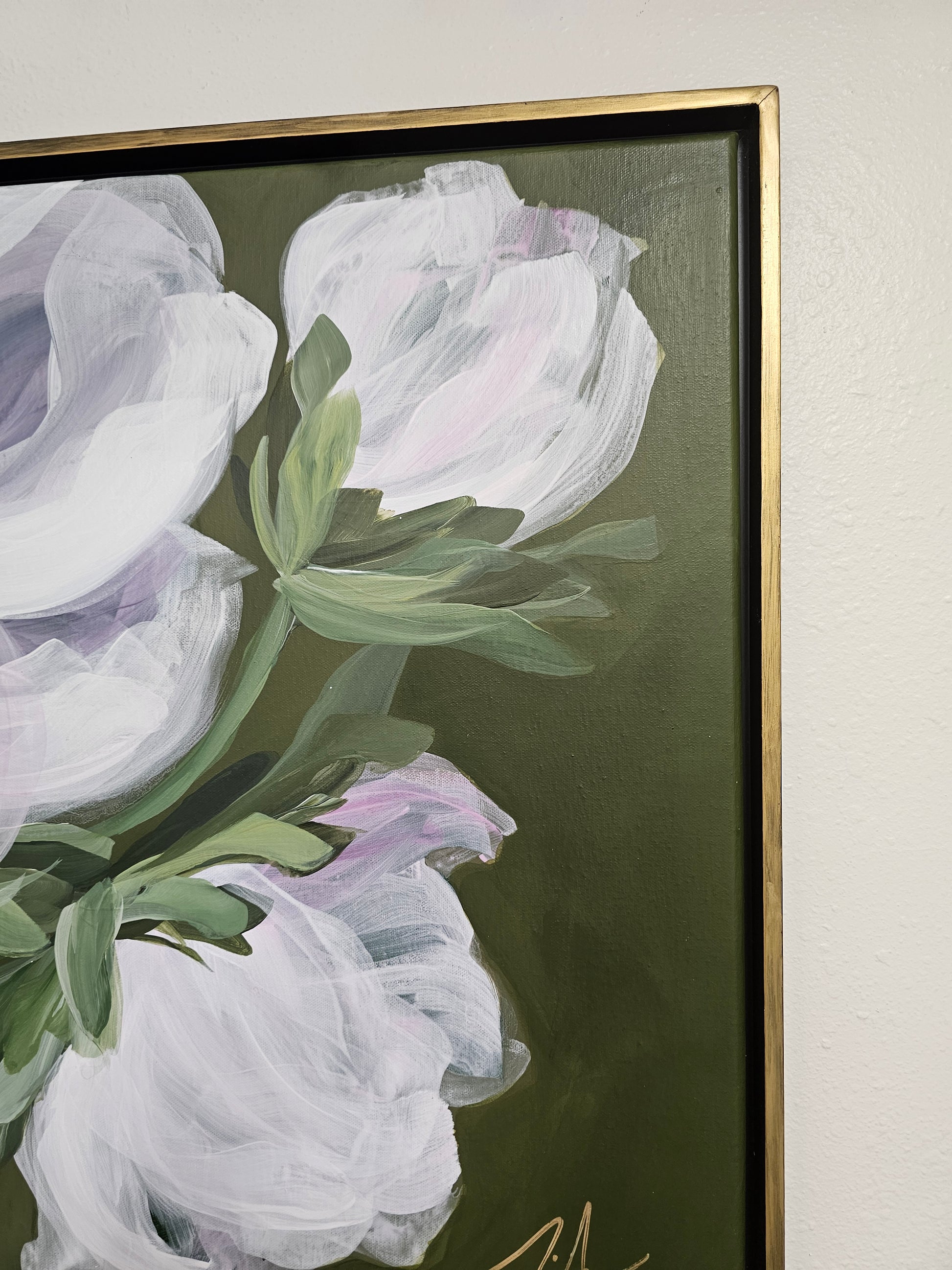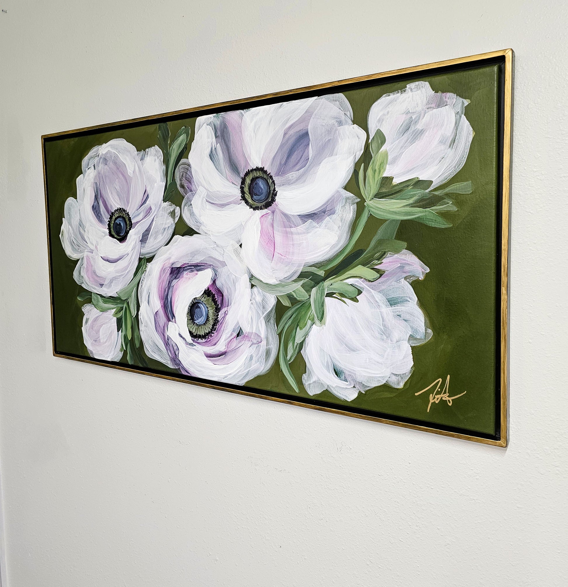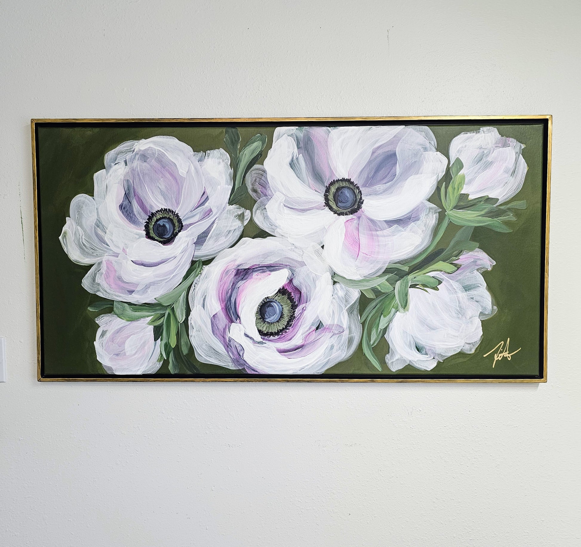 - This gorgeous anemone painting showcases a harmonious blend of soft violets, creamy whites, blues and mossy green accents. It is an original hand-painted acrylic masterpiece on a 24x36 canvas, complete with a distressed gold & black floater frame and pre-installed hardware for easy wall mounting. The painting is finished with a matte varnish that offers UV protection, is non-yellowing, and water-resistant.