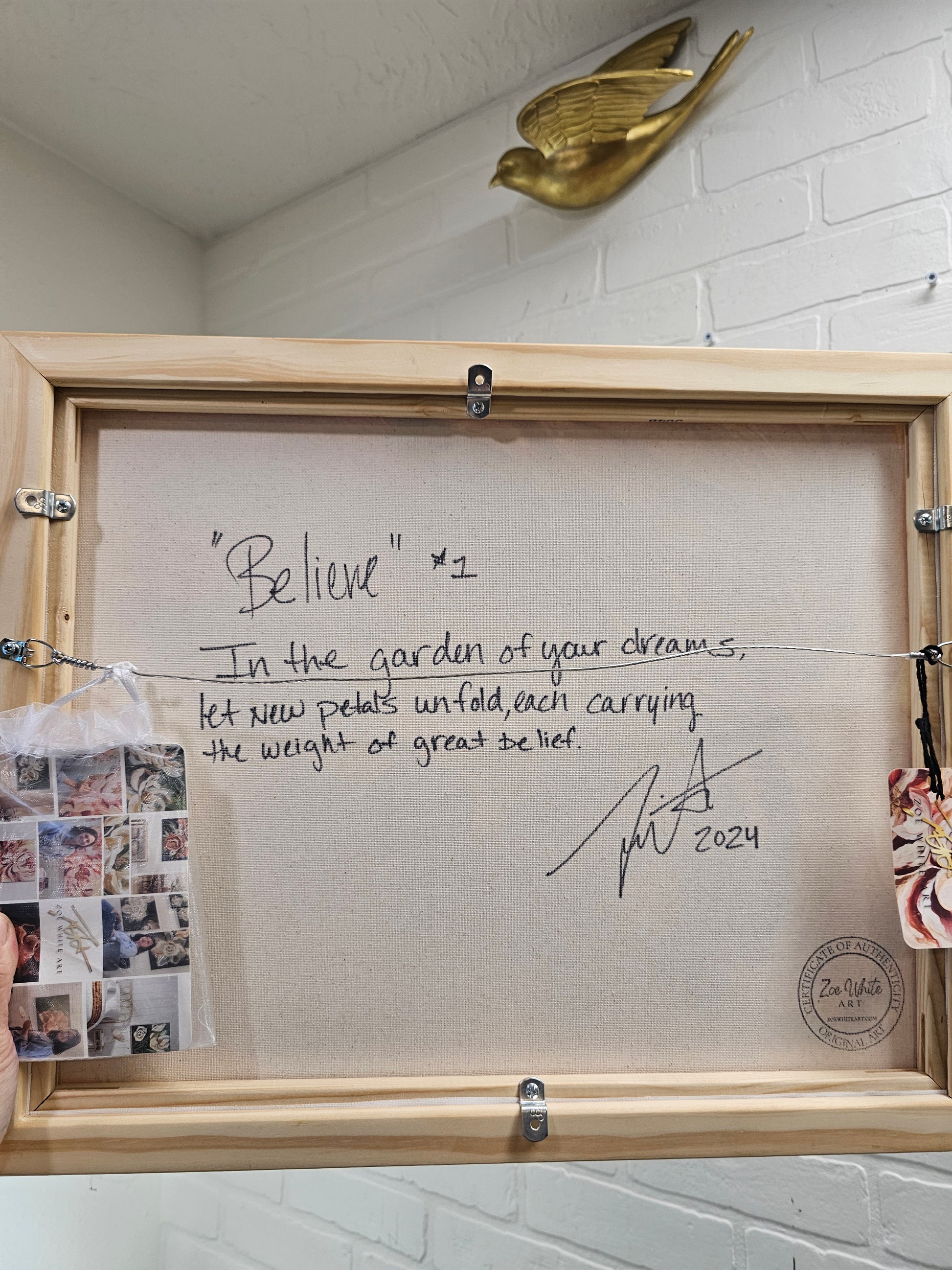 - Â Special Message:Â I love to personalize all my paintings with a special message. On the back of this painting, I've written: "In the garden of your dreams let new petals unfold, each carrying the weight of great belief."