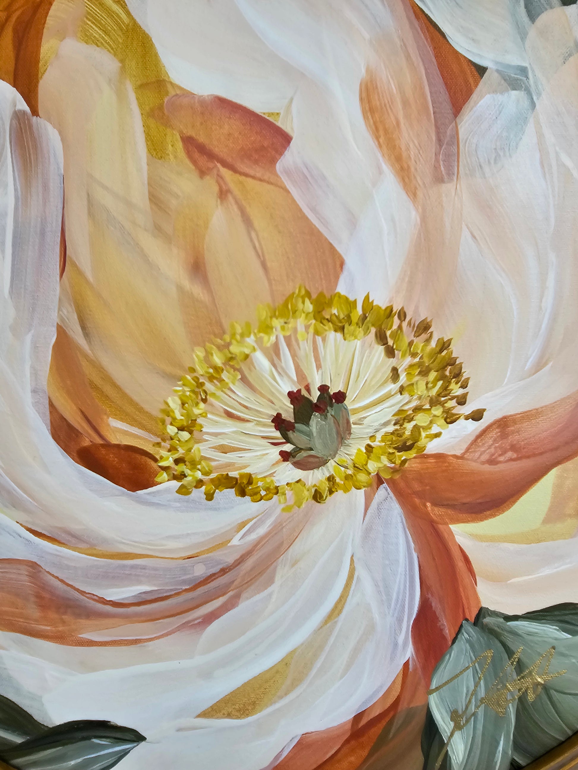 - My Creative Process: As I create my floral paintings, I draw inspiration from the various stages of a flower’s growth transformation. From the vivid and fresh hues during blossoming to the gradual shift toward deep & rich colors as they gracefully fade. Using acrylic paint as my preferred medium, I layer multiple colors to create depth and apply spontaneous brushstrokes to capture the essence of these beautiful moments.Â