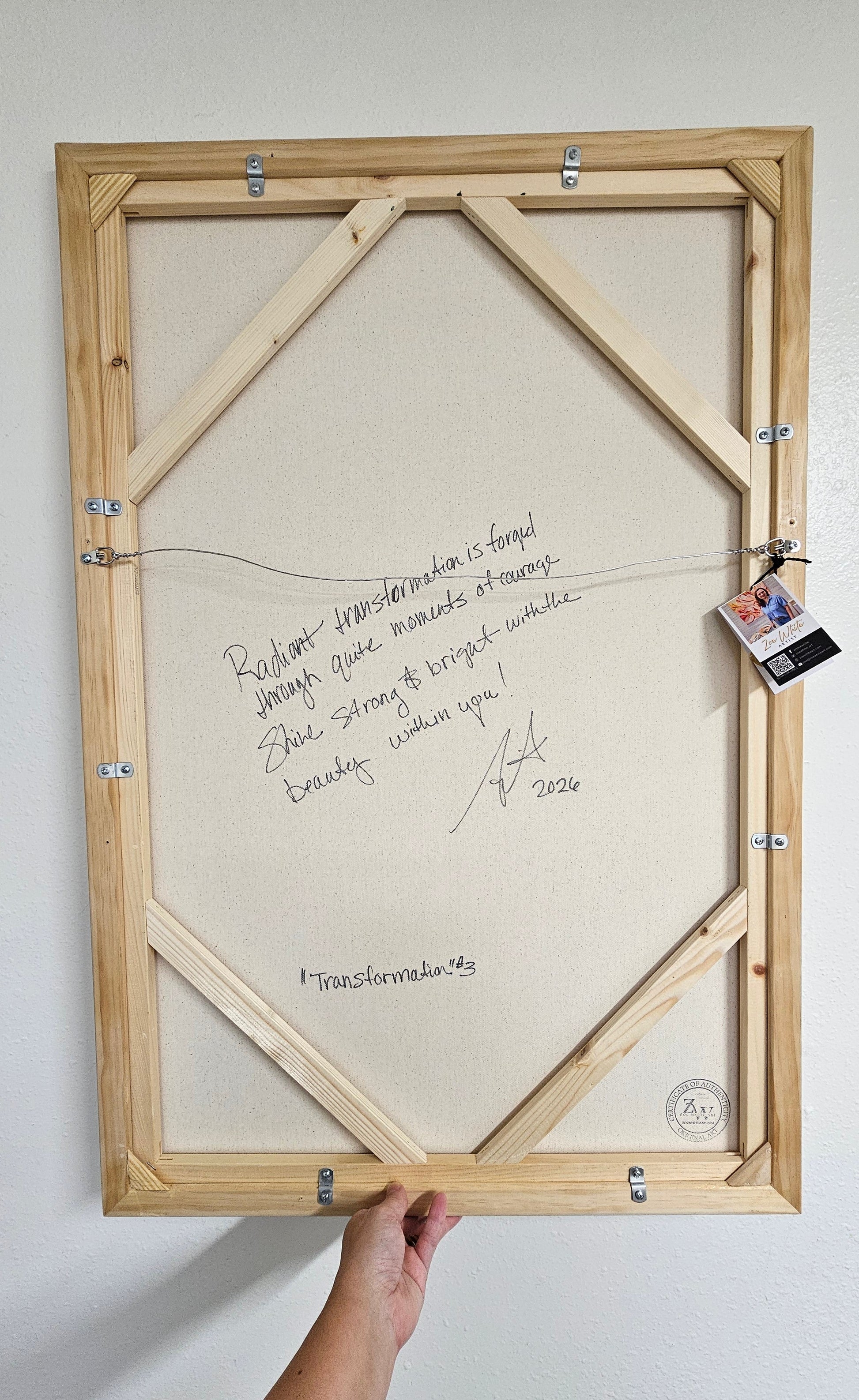 - Special Message: I love to personalize all my paintings with a special message. On the back of this painting, I've written: "Radiant transformation is forged through quite moments o courage. Shine strong & bright with the beauty within you!