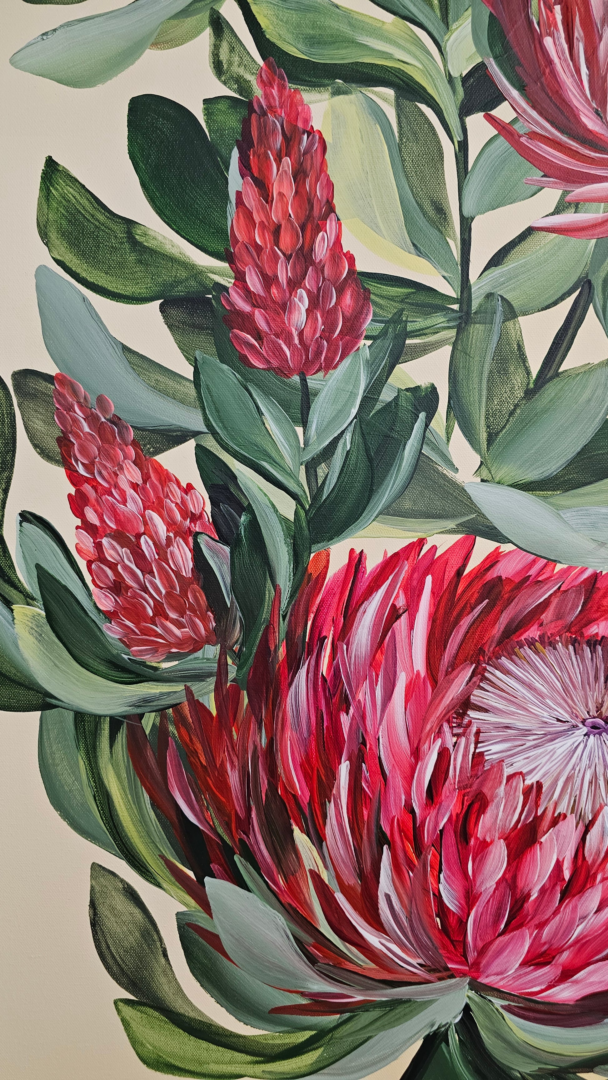 - This gorgeous Protea flower painting features a perfect harmony of reds, pinks cream whites blended, mossy green foliage and cream yellow background. It is an original hand-painted acrylic masterpiece on a 24x36 canvas, complete with a 1inch wooden floater frame and pre-installed hardware for easy wall mounting.