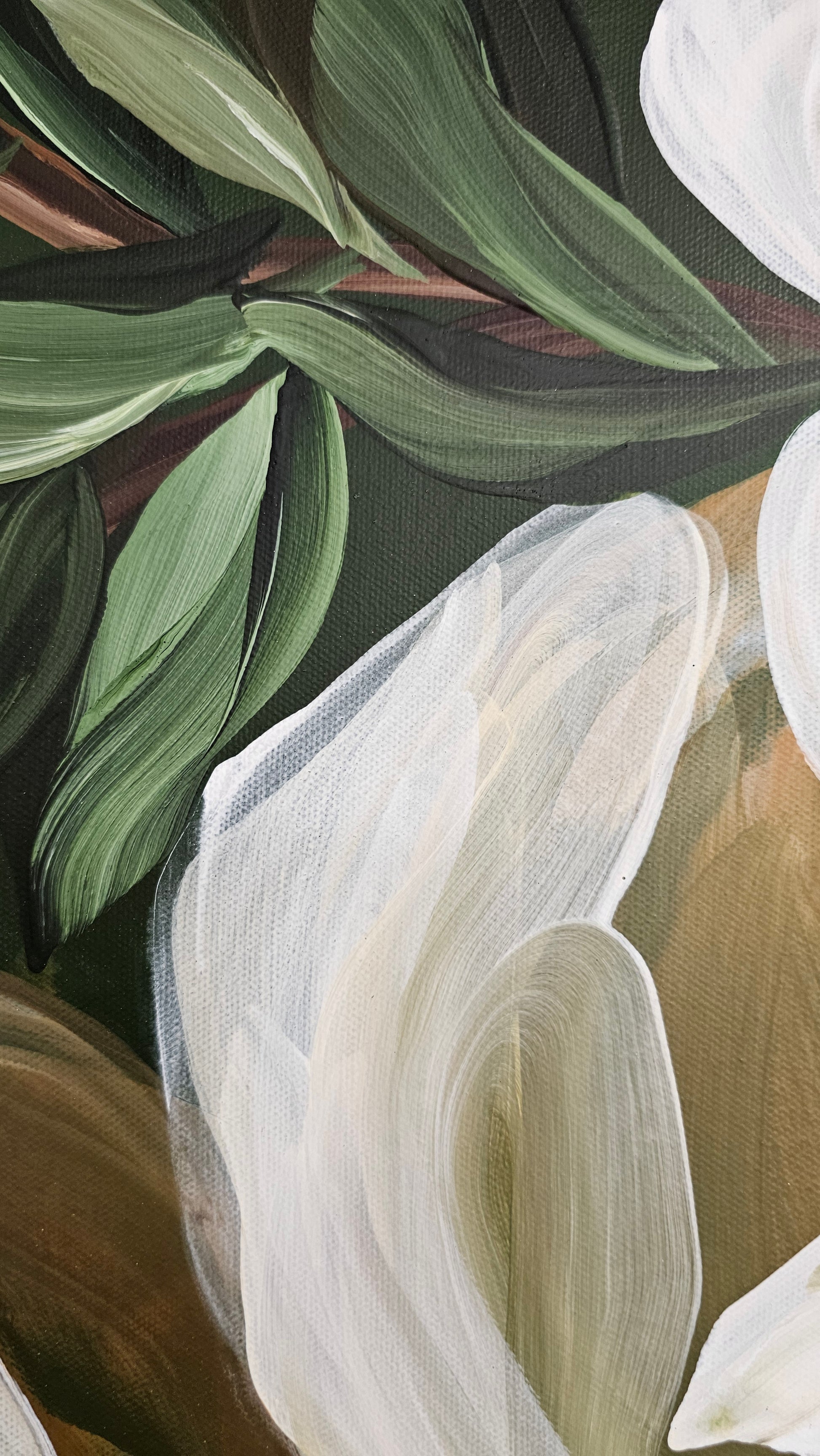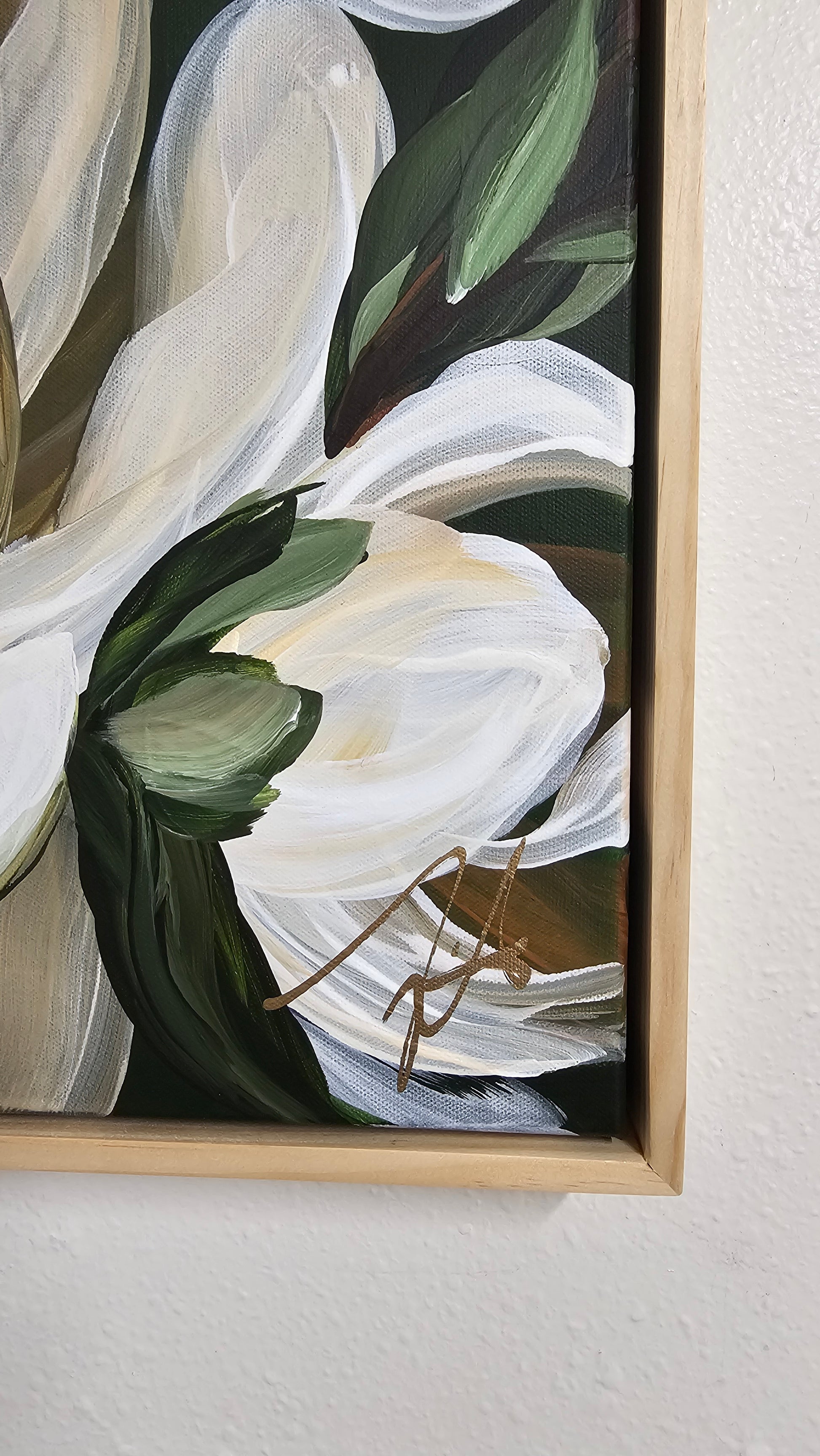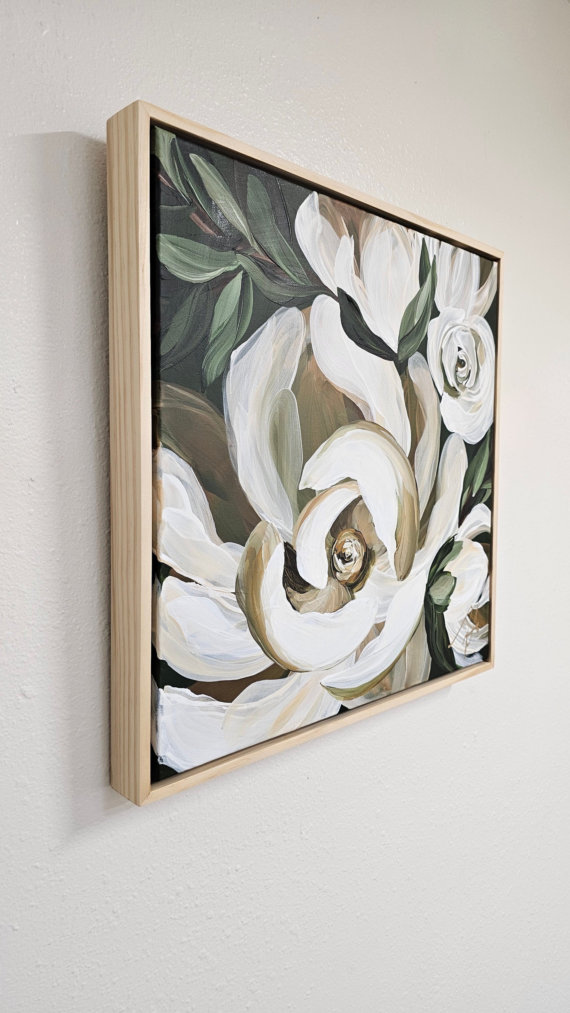 - This beautiful Magnolia flower painting features a perfect harmony of creamy whites blended with golden beige shadows, lush green foliage and mossy green background. It is an original hand-painted acrylic masterpiece on a 20x20 canvas, complete with a 2inch depth wooden floater frame and pre-installed hardware for easy wall mounting.