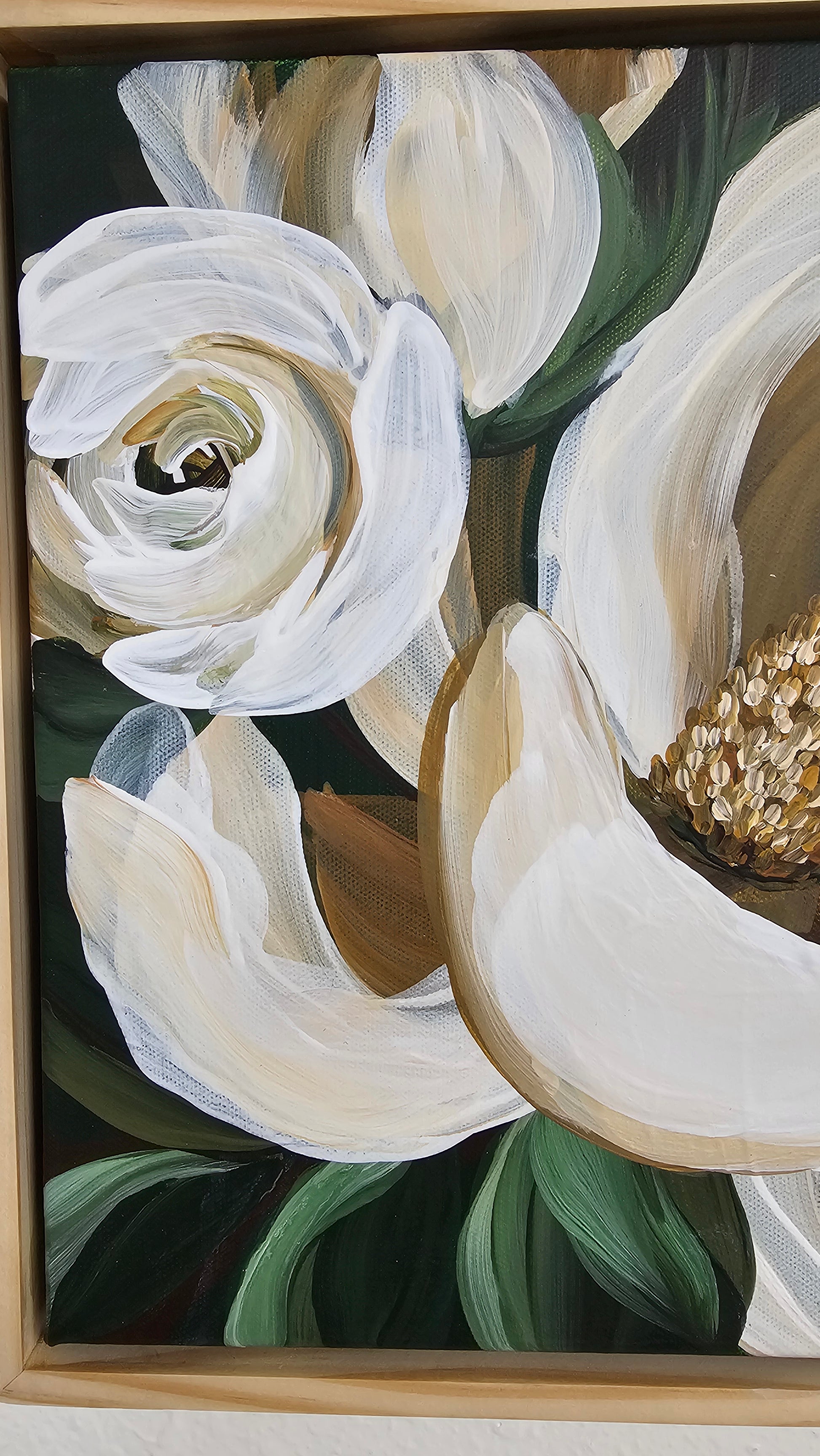 - This elegant magnolia flower painting features a perfect harmony of creamy whites blended and mossy green background. It is an original hand-painted acrylic masterpiece on a 12x12 canvas, complete with a 2inch depth wooden floater frame and pre-installed hardware for easy wall mounting.