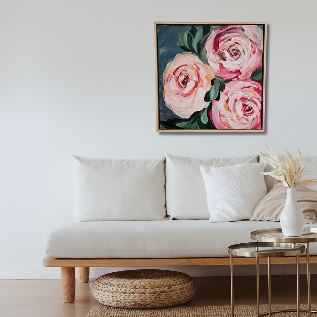 - This gorgeous rose flower painting features a perfect harmony of pinks, coral, creamy whites blended with golden yellows and soft blue background. It is an original hand-painted acrylic masterpiece on a 20x20 canvas, complete with a 1inch wooden floater frame and pre-installed hardware for easy wall mounting.