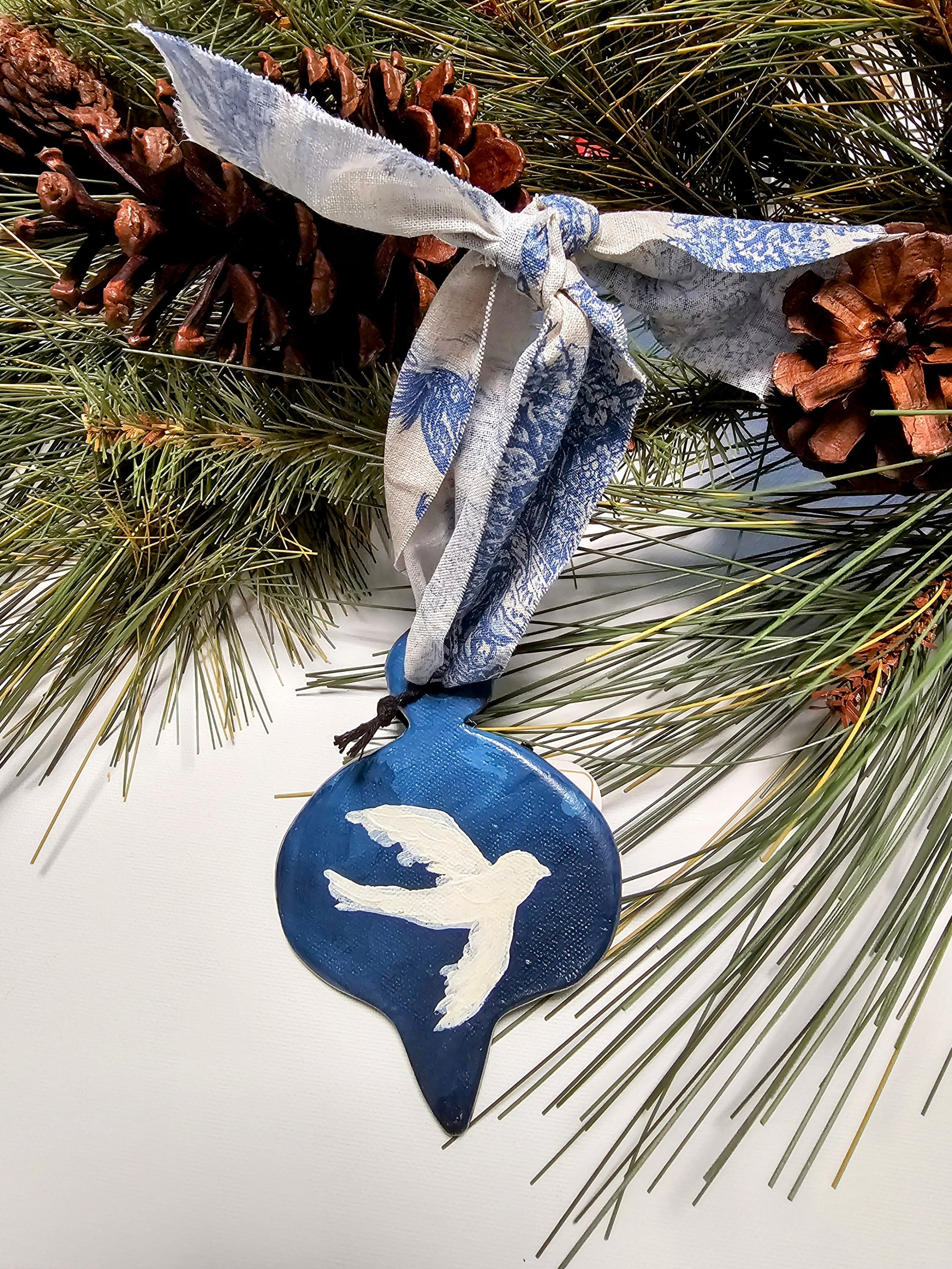 This unique ornament was meticulously handcrafted from porcelain clay, fired in a kiln, and then carefully hand-painted. Each piece is a one-of-a-kind work of art, specially created to highlight its beauty. The Dove ornament features a French blue & cream Toile fabric ribbon, adding an elegant touch for hanging.