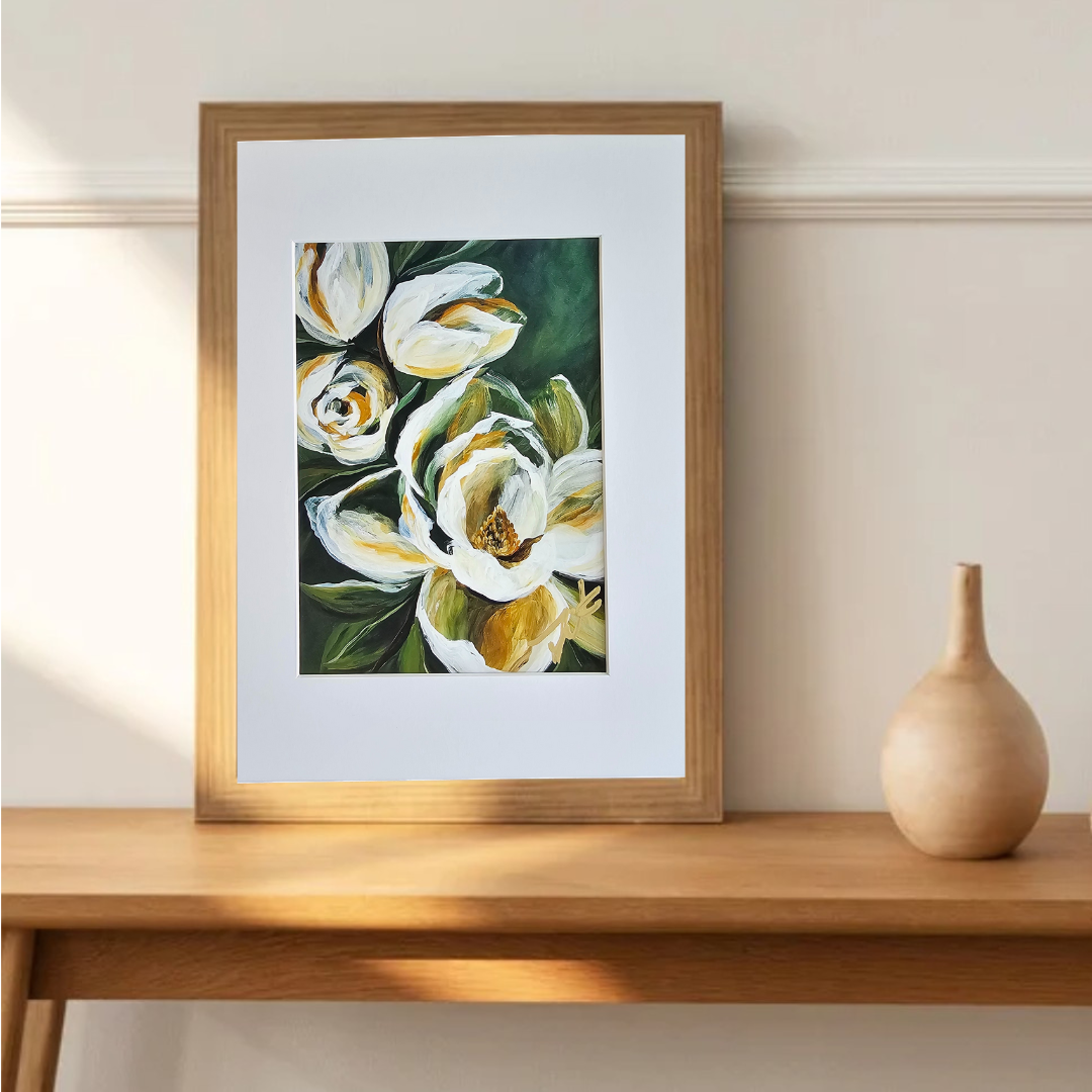 Each print is a high-quality fine art reproduction of an original painting by Zoe White. The print is paired with an acid-free white mat, creating an elegant ready-to-frame work of art for your home.