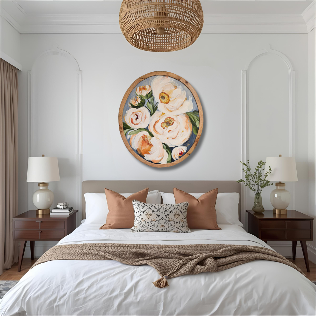 - These custom created elegant peony feature creamy pink, mossy greens, and a blue background, perfectly complemented by a custom-built light natural wood frame for that finishing touch. This is an original hand-painted acrylic painting on a custom-built wood canvas board, complete with a frame and hardware wire for convenient wall hanging.