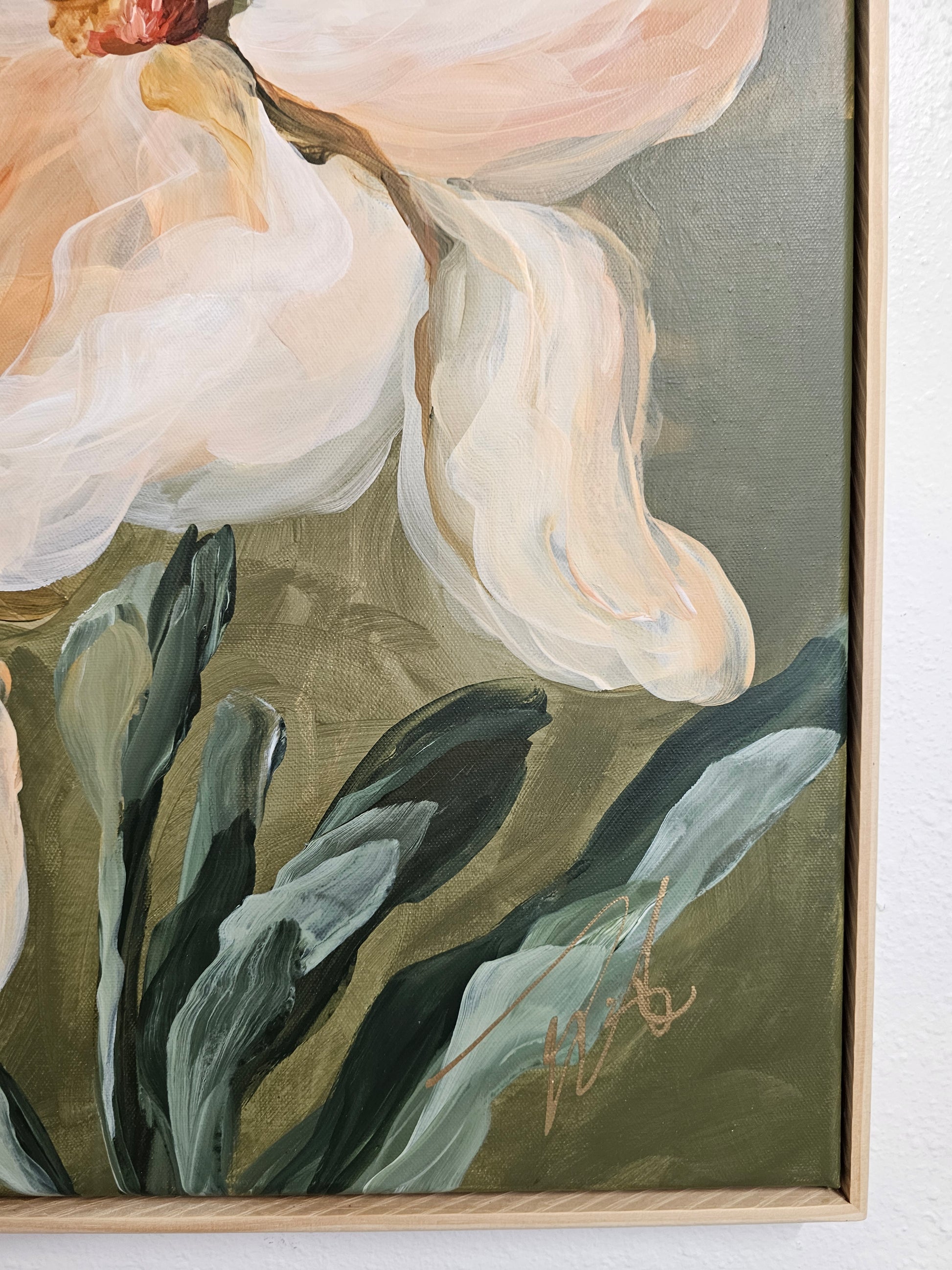 - This stunning Irises artwork showcases a harmonious blend of soft pinks, creamy whites, and mossy green accents. It is an original hand-painted acrylic masterpiece on a 24x36 canvas, complete with a 1-inch wooden floater frame and pre-installed hardware for easy wall mounting. The painting is finished with a matte varnish that offers UV protection, is non-yellowing, and water-resistant.