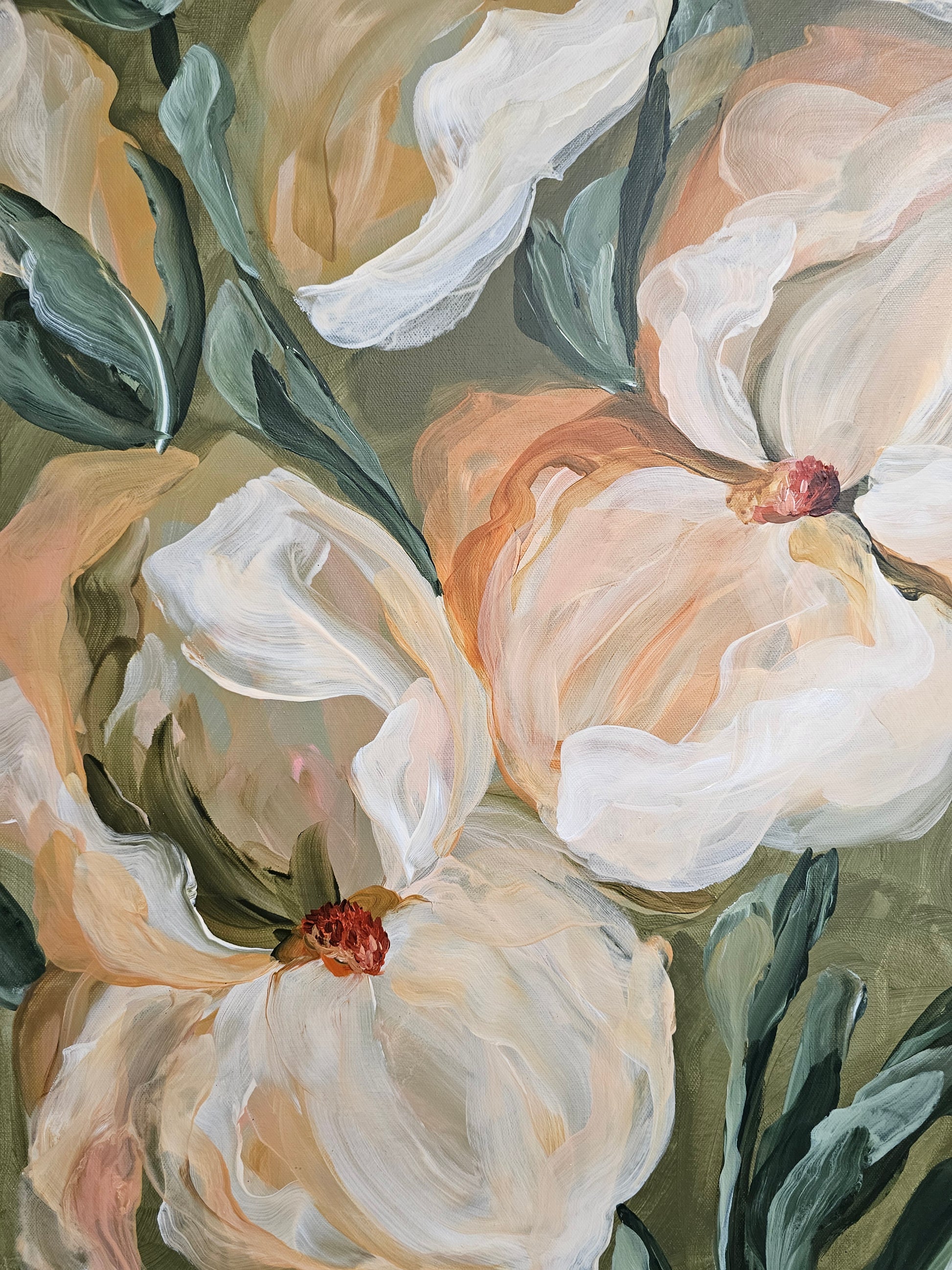 - My Creative Process: As I create my floral paintings, I draw inspiration from the various stages of a flower’s growth transformation. From the vivid and fresh hues during blossoming to the gradual shift toward deep & rich colors as they gracefully fade. Using acrylic paint as my preferred medium, I layer multiple colors to create depth and apply spontaneous brushstrokes to capture the essence of these beautiful moments.