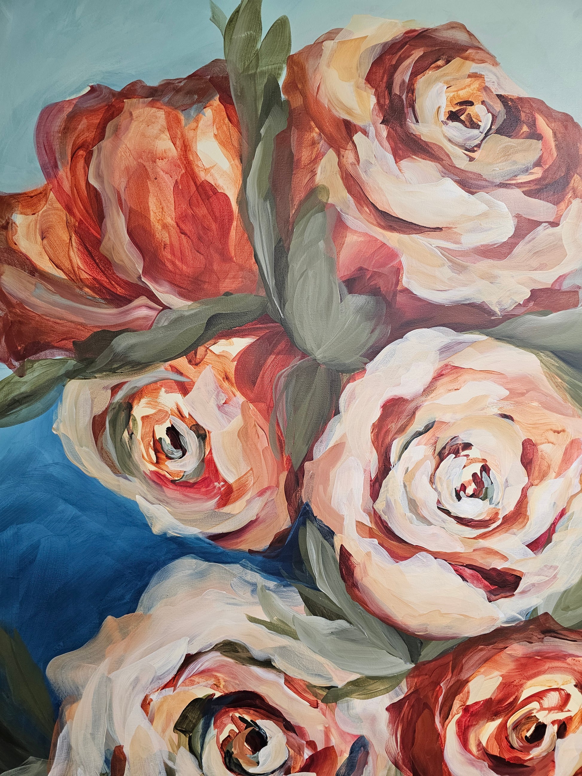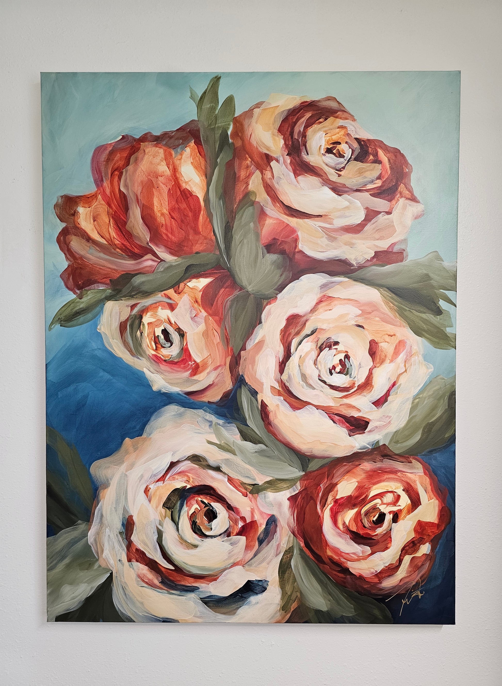 - These beautiful rose painting features vibrant reds, creams hues, blues and mossy greens. This is an original hand-painted acrylic painting on a 36x48 gallery-wrapped canvas with 1 1/2-inch painted sides and hardware on the back for convenient wall hanging. The painting is finished with a matte varnish that offers UV protection, is non-yellowing, and water-resistant.
