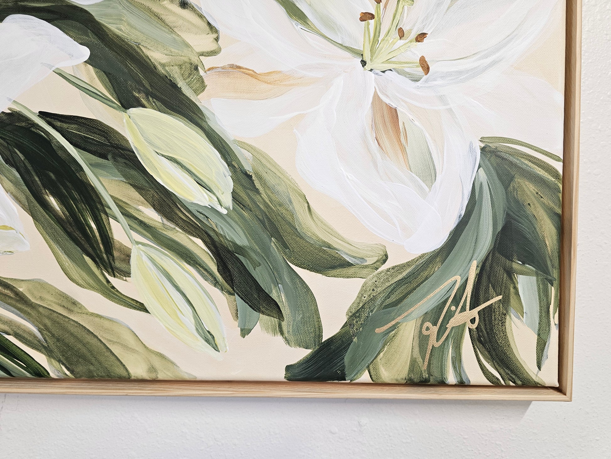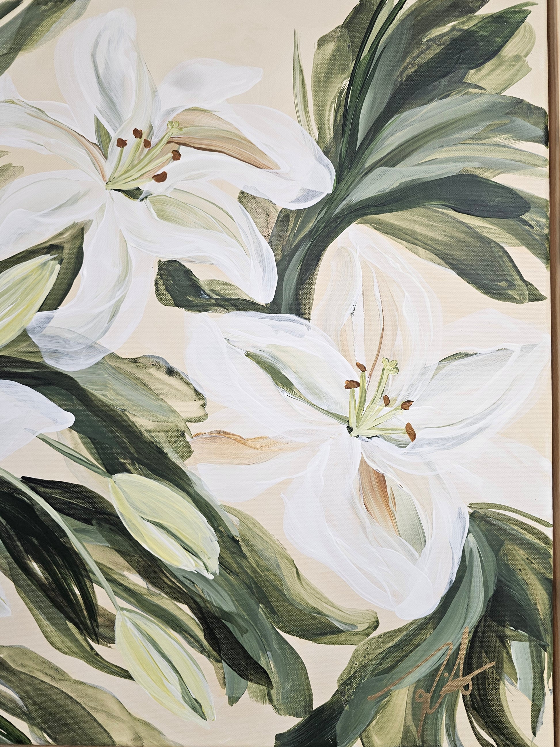 - This gorgeous lily flower painting features a perfect harmony of creamy whites blended with golden yellows and mossy green accents. It is an original hand-painted acrylic masterpiece on a 24x36 canvas, complete with a 1inch wooden floater frame and pre-installed hardware for easy wall mounting. The painting is finished with a matte varnish that offers UV protection, is non-yellowing, and water-resistant.Â