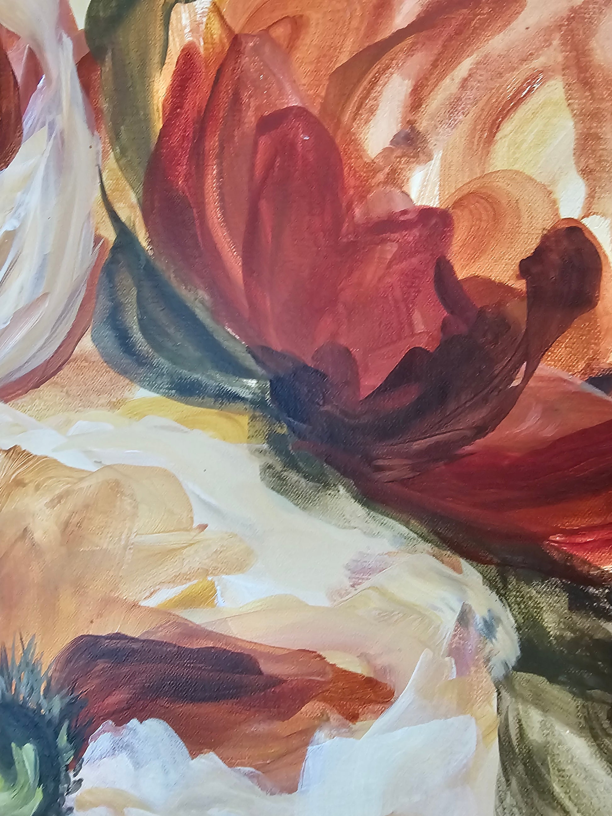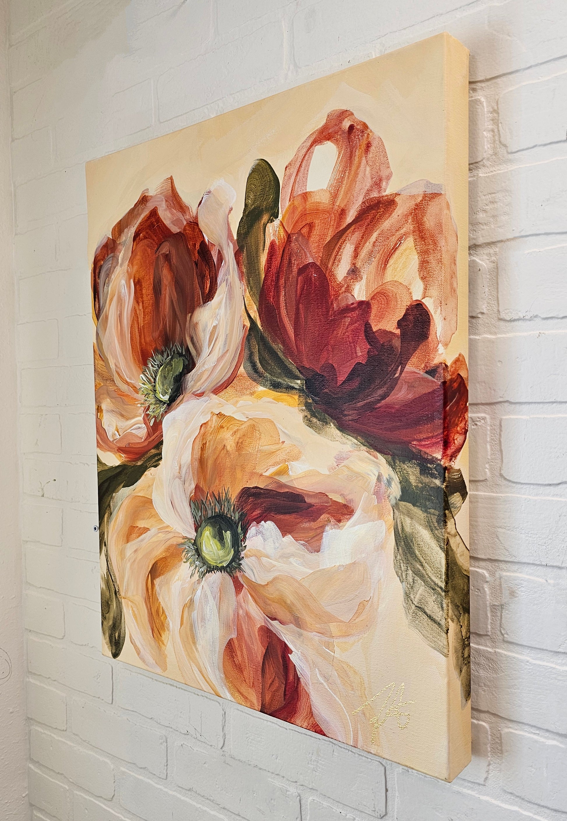 - My Creative Process: As I create my floral paintings, I draw inspiration from the various stages of a flower’s growth transformation. From the vivid and fresh hues during blossoming to the gradual shift toward deep & rich colors as they gracefully fade. Using acrylic paint as my preferred medium, I layer multiple colors to create depth and apply spontaneous brushstrokes to capture the essence of these beautiful moments.Â
