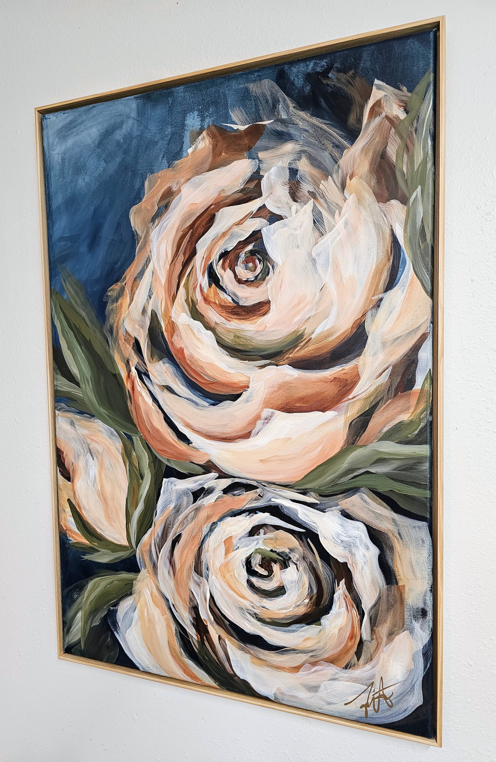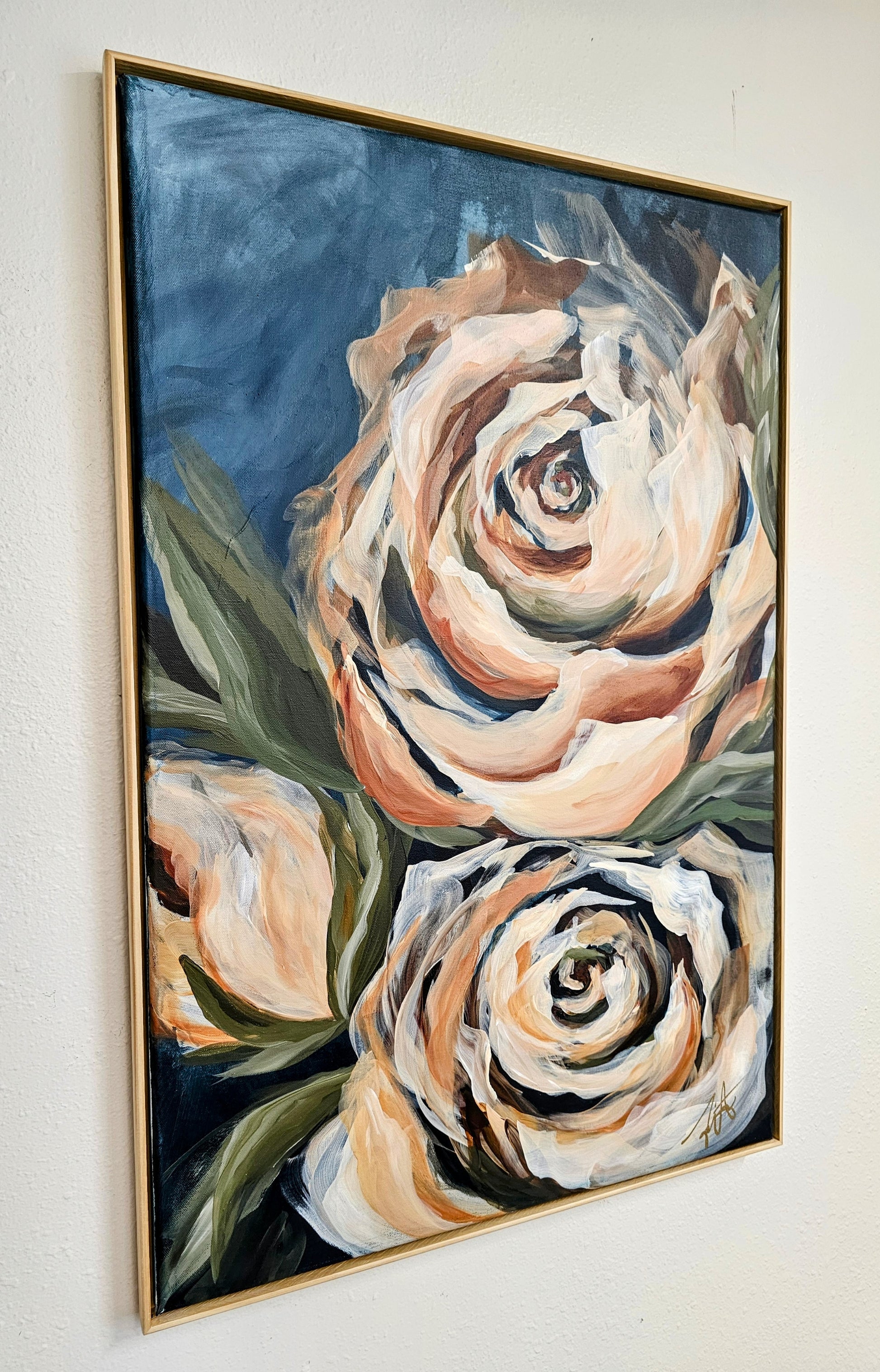 - These beautiful roses feature burnt sienna red with soft cream, mossy green hues and navy blue background. The painting is beautifully complemented by a natural wood floater frame for that finishing touch. This is an original hand-painted acrylic painting on a 24x36 canvas, complete with a wood frame and hardware on the back for convenient wall hanging. The floater frame allows you to see the full surface of the painting. The painting is finished with a matte varnish that offers UV protection, is non-yellowing, and water-resistant.