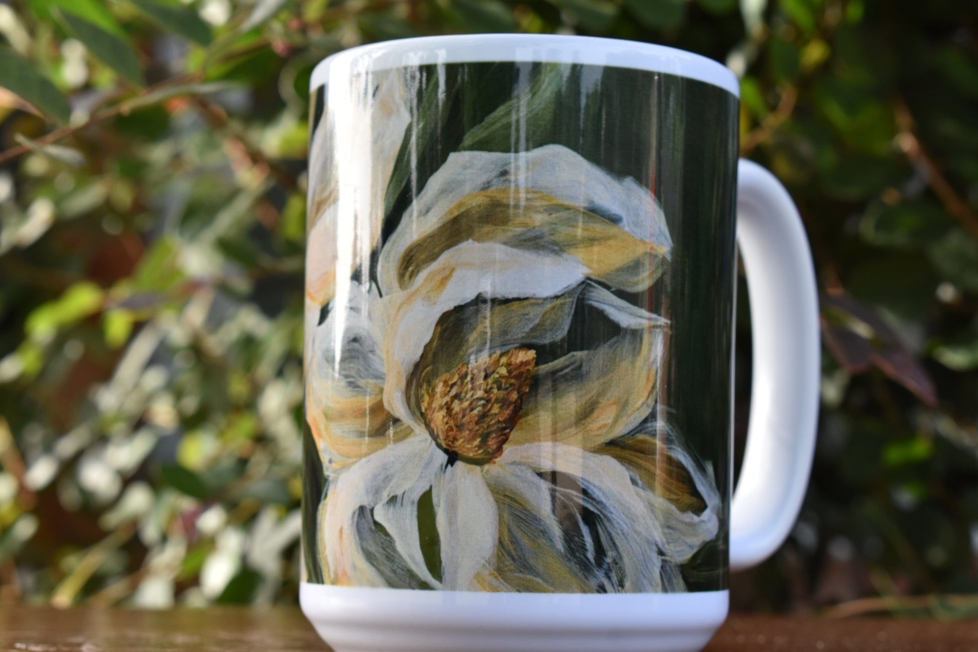 Enjoy coffee, tea, or a cozy cup of hot chocolate, this beautiful Magnolia floral custom mug. The painting on the mug is high resolution copy of an original Zoe White painting.
