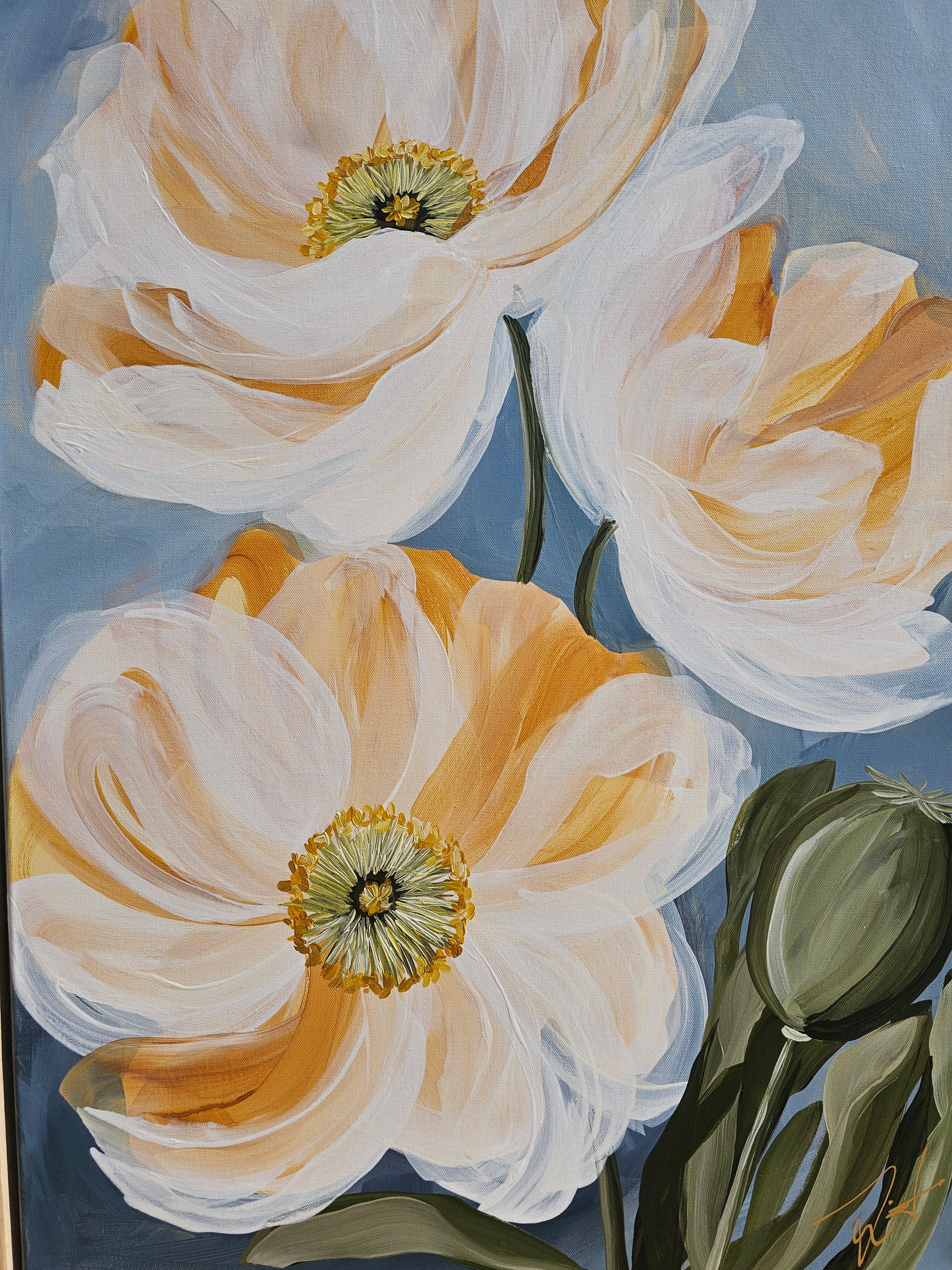 - This breathtaking Poppy flower painting features a perfect harmony of soft cream whites blended with golden yellows and blues with charming mossy green accents. It is an original hand-painted acrylic masterpiece on a 24x36 canvas, complete with a 1inch wooden floater frame and pre-installed hardware for easy wall mounting. The painting is finished with a matte varnish that offers UV protection, is non-yellowing, and water-resistant.Â