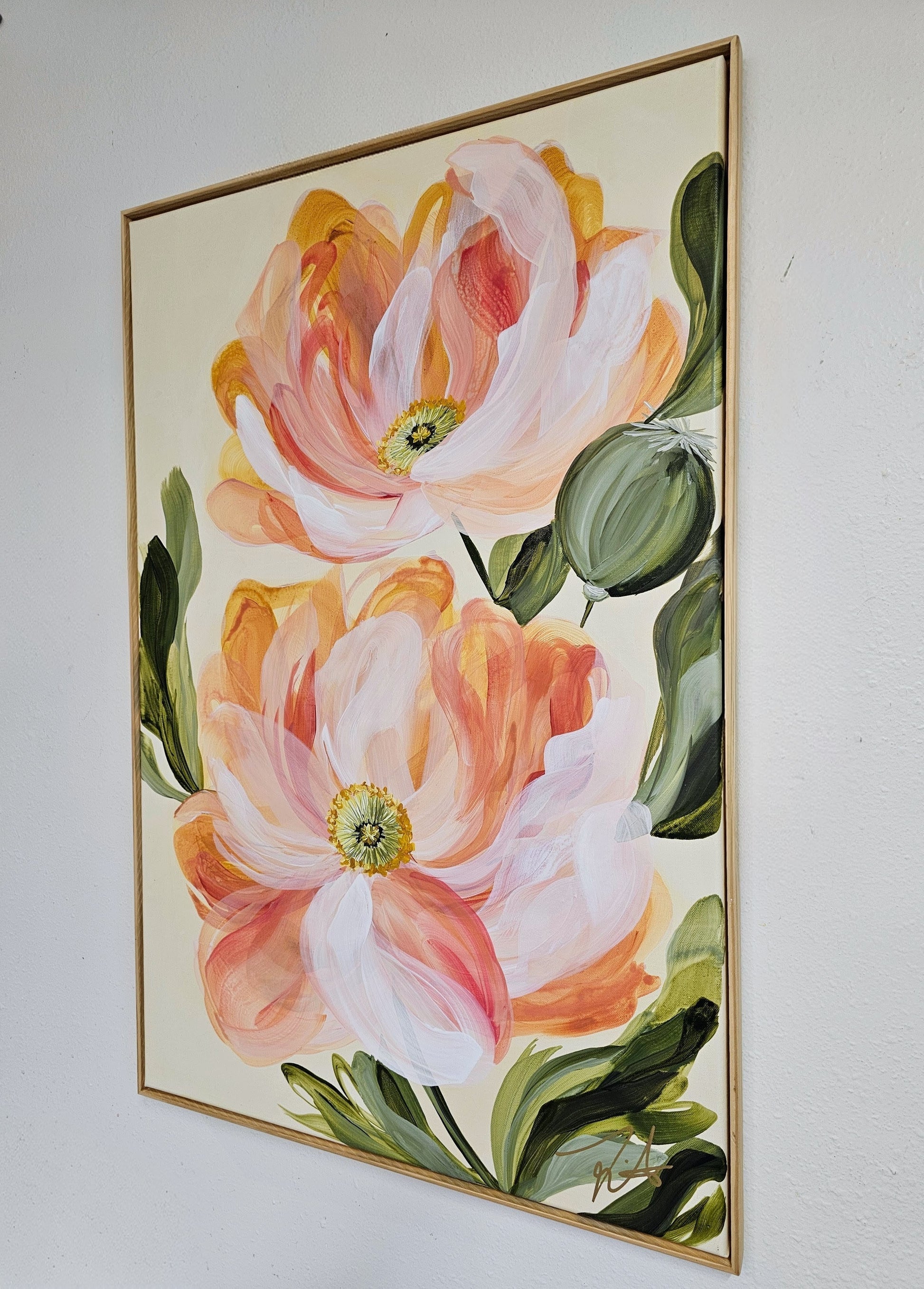 - This gorgeous poppy flower painting features a perfect harmony of soft pinks & peach blending cream whites and mossy green accents. It is an original hand-painted acrylic masterpiece on a 24x36 canvas, complete with a 1inch wooden floater frame and pre-installed hardware for easy wall mounting. The painting is finished with a matte varnish that offers UV protection, is non-yellowing, and water-resistant.Â