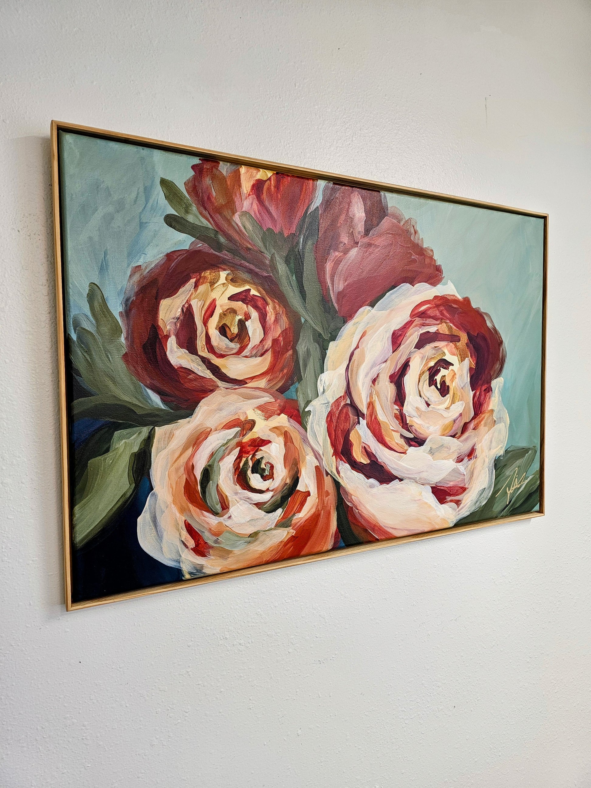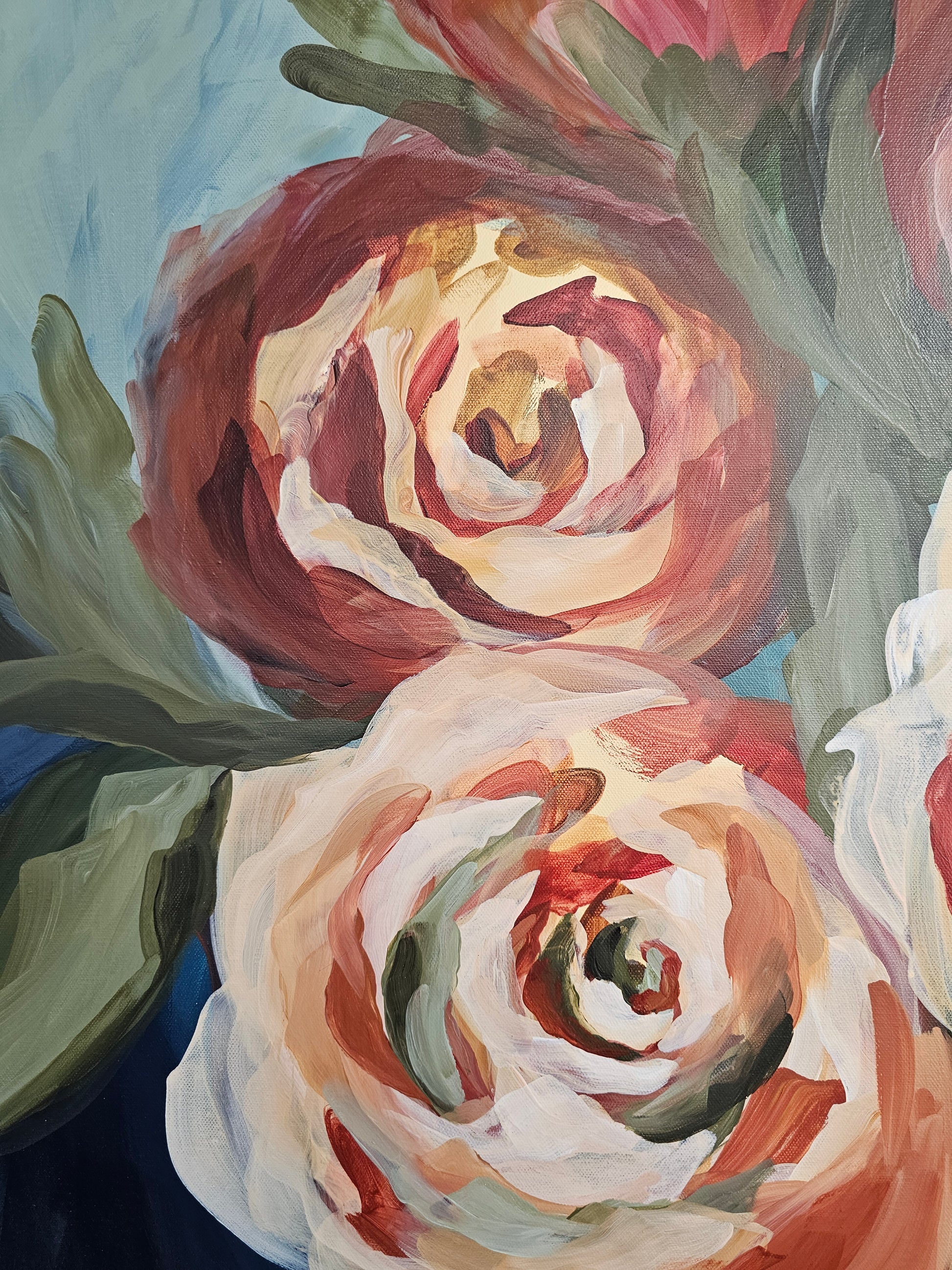- This stunning rose artwork showcases a harmonious blend of vibrant pinks, creamy whites, blues and mossy green accents. It is an original hand-painted acrylic masterpiece on a 24x36 canvas, complete with a 1-inch wooden floater frame and pre-installed hardware for easy wall mounting. The painting is finished with a matte varnish that offers UV protection, is non-yellowing, and water-resistant.