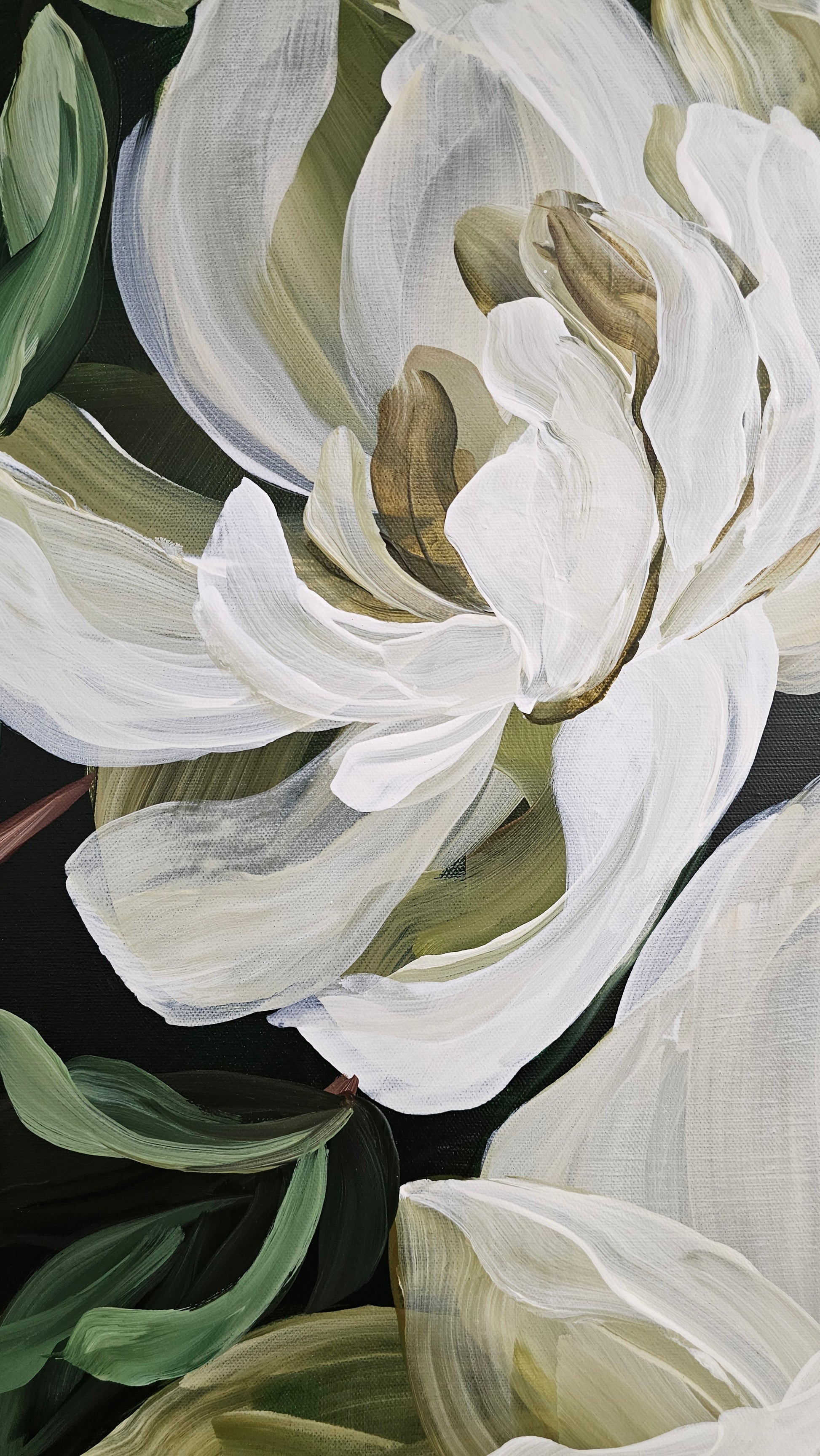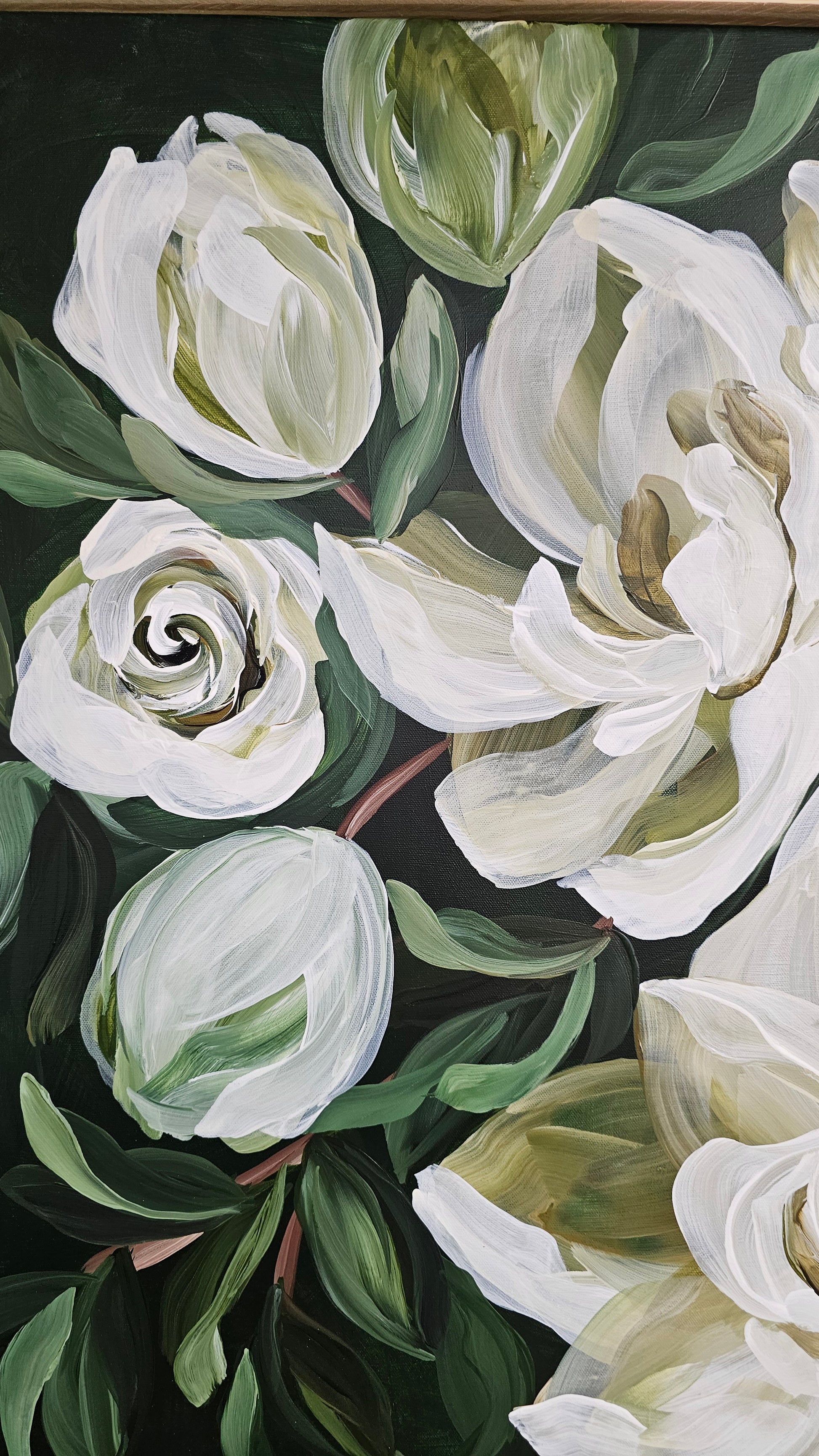 - This elegant gardenias flower painting features a perfect harmony of creamy whites blended with beige and mossy green accents. It is an original hand-painted acrylic masterpiece on a 30x40 canvas, complete with a 1inch wooden floater frame and pre-installed hardware for easy wall mounting.