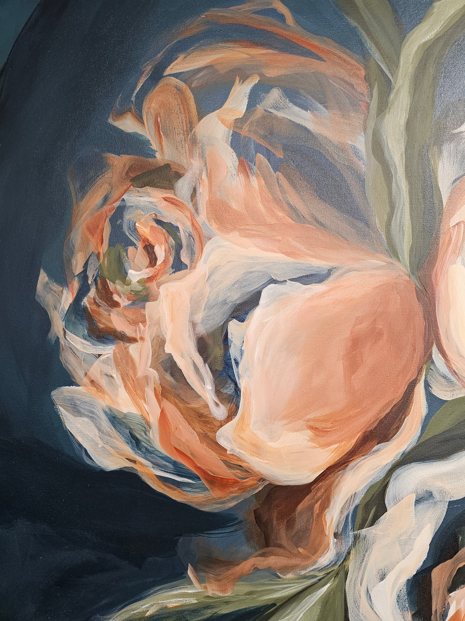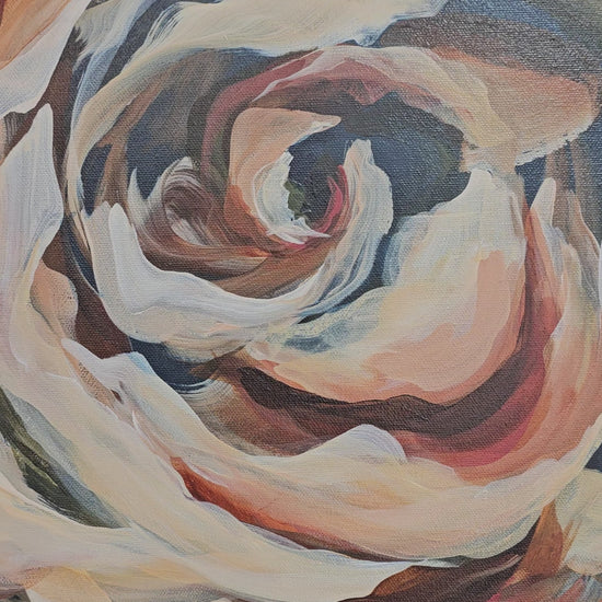 - These beautiful roses feature burnt sienna red with soft cream, mossy green hues and navy blue background. This is an original hand-painted acrylic painting on a 36x36 gallery-wrapped canvas with 1 1/2-inch painted sides and hardware on the back for convenient wall hanging. The painting is finished with a matte varnish that offers UV protection, is non-yellowing, and water-resistant.