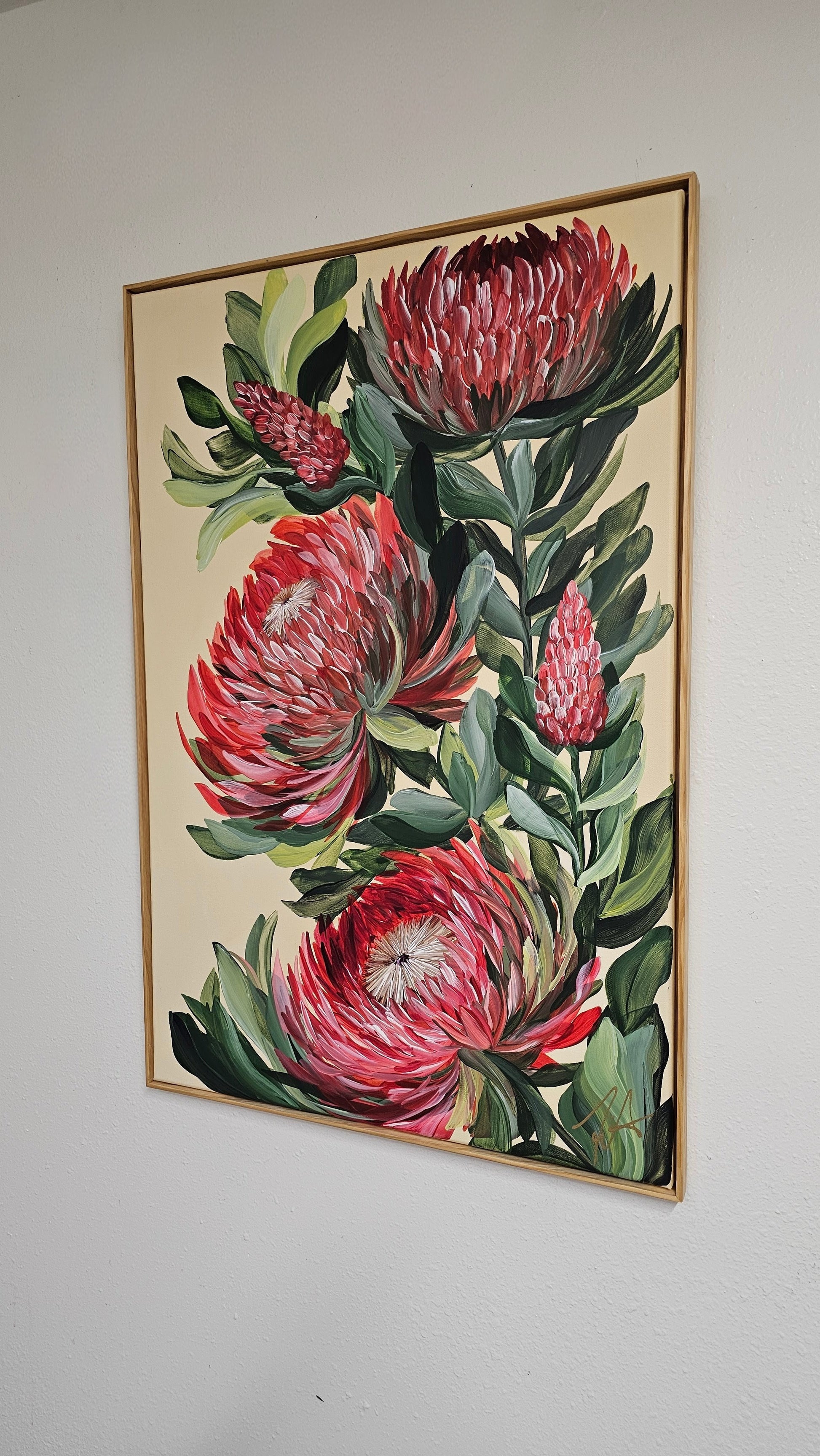 - This gorgeous Protea flower painting features a perfect harmony of reds, pinks cream whites blended, mossy green foliage and cream yellow background. It is an original hand-painted acrylic masterpiece on a 24x36 canvas, complete with a 1inch wooden floater frame and pre-installed hardware for easy wall mounting.